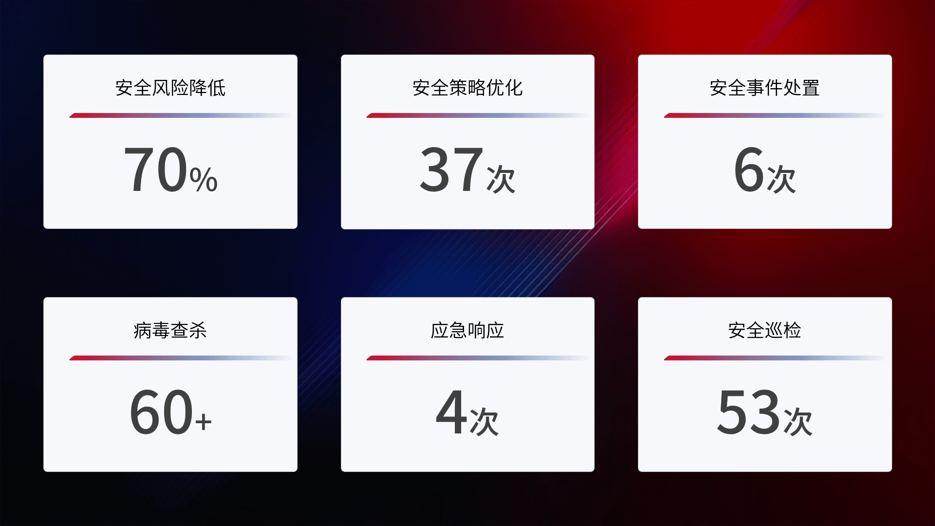 提供全面的安全事件报告体系,,包括处置报告、、、周报、、、季度和年度总结,,结合持续监控,,,帮助客户深入了解网络安全状况。。。