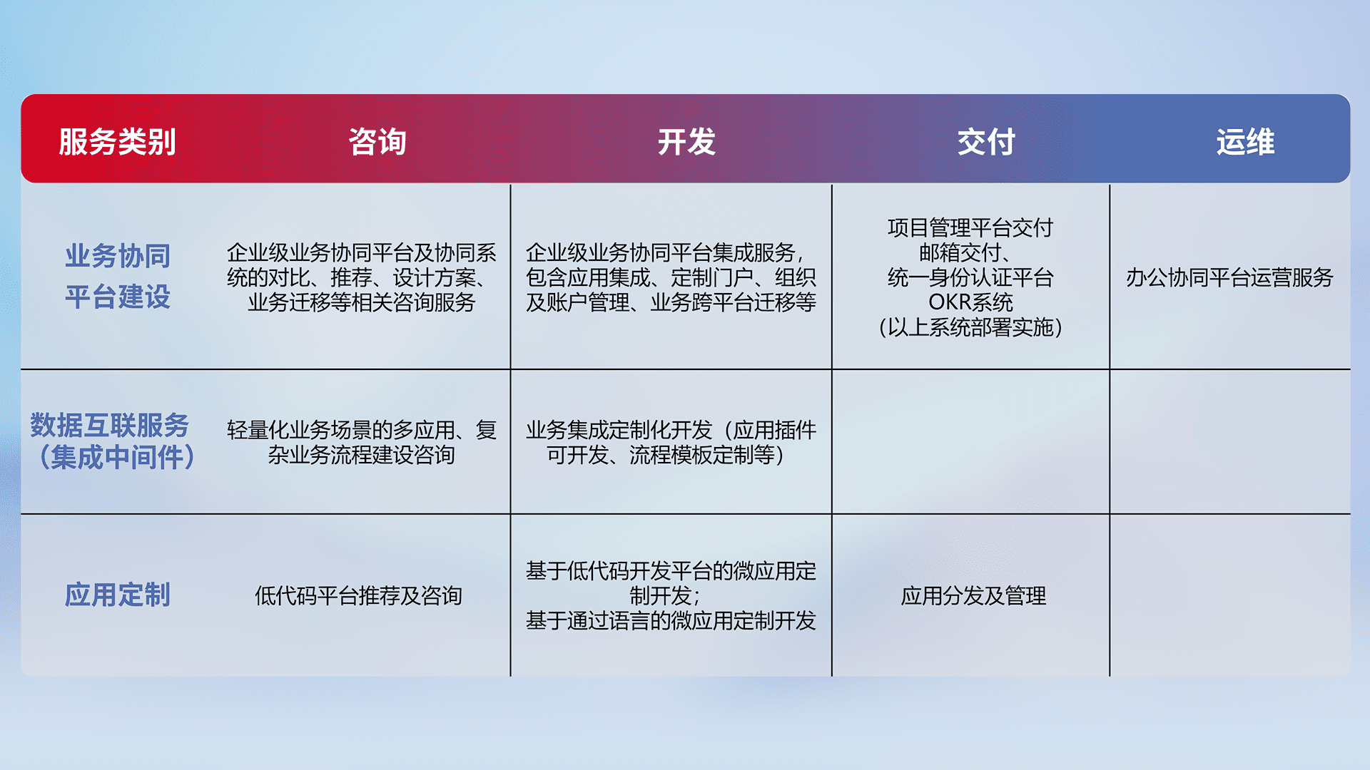 针对钉钉、、、、企微、、、IDaas等平台级产品提供产品的规划、、、、方案、、、交付、、定制化开发等服务,,,实现如统一协同办公、、、、智能客户服务、、、混合会议管理、、、智能数据查询、、、等业务场景,,实现数字化转型。。。。